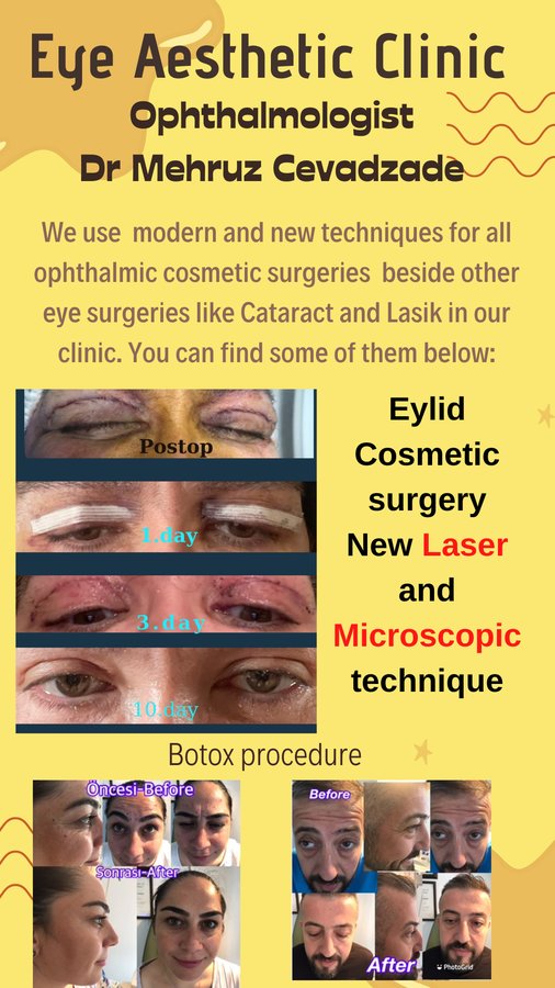 عن عيادة الدكتور مهروز سيفادزاده للعيون وجراحة العيون التجميلية عيادة الدكتور مهروز سيفادزاده للعيون والجماليات والخيوط تقع في إزمير / تركيا بدأ الدكتور م. سيفادزاده العمل ككبير أطباء العيون في مستشفى وزارة الصحة التركية في أكسيكي -ANTALYA وأيضًا كرئيس الأطباء ورئيس المستشفى لمدة 9 أشهر. بعد ذلك الوقت عمل كرئيس لعيادات أمراض العيون في المستشفيات القطرية التابعة لوزارة الصحة واستقال في 21.11.. 2004 من الوزارة وبدأ العمل في العيادات الخاصة كرئيس لع... (عرض المزيد)
