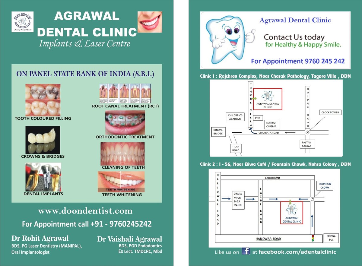 About Agrawal Dental Clinic Implant and Laser Center One of the finest Dental Clinic in Dehradun. Agrawal Dental Clinic : Implants & Laser Centre, Dehradun is equipped with ultra modern equipments providing the Best of Dentistry having World Class Infrastructure.The Clinic is equipped with Digital X-rays preventing the patient from unwanted harmful X-rays. All dental treatments are carried here from Kids Dentistry to Cosmetic Dentistry ... (Show more)