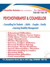 About New About You கவுன்சிலிங் & சைக்கோதெரபி கவுன்சிலிங் யார் யார்க்கெல்லாம் ? * குழந்தைகள் / Students * டீன் ஏஜ் / Teenage & Adolescence * திருமண ஆலோசணை / Premarital Counseling * தம்பதியர்கள் / Couples * குடும்ப நலம் / Family * வயதானவர்கள் / Old age @ கற்றல் குறைபாடுகள் நீக்க வழி வகைகள் Learnjng difficulty Managment @ கோபம் / பயம் போக்க வழி ம... (Show more)