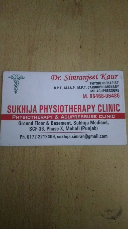 About Sukhija Physiotherapy Clinic Experienced physiotherapist doctor, class topper in masters of physiotherapy with 42 additional manual therapy skills to cure you from all neurological (numbness,pains and weakness or paralysis, cerebral palsy, bells palsy), orthopedic problems (like cervical and back pain, post fracture stiffness, frozen shoulder, tennis elbow,etc), gynecological problems (urine incontinence, pregnancy) and cardiopulm... (Show more)