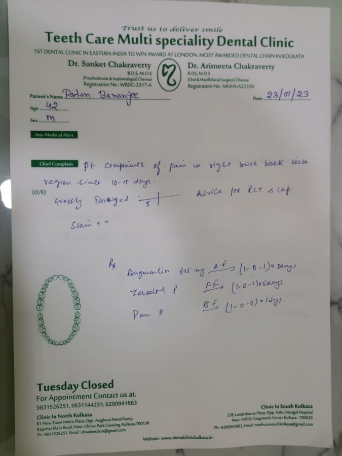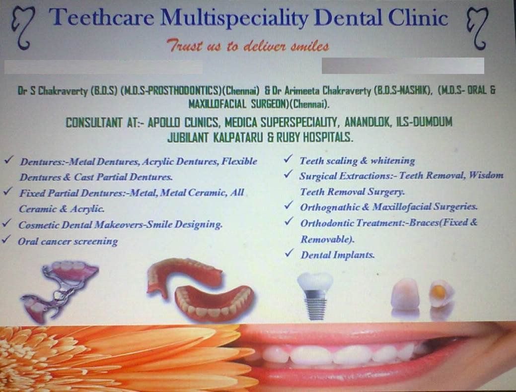 About Teeth Care Multispeciality Dental Clinic Teeth care Multispeciality Dental Clinic is an affordable, Multi speciality Dental Clinic in Kolkata, India offers most advanced Cosmetic, Implant, Conventional and Preventive dentistry. We at Teeth Care offer Transparent and Affordable Prices in our clinic. Teeth are extremely important for most of our daily functions. Preventive dental care is a prerequisite today to have healthy and spa... (Show more)